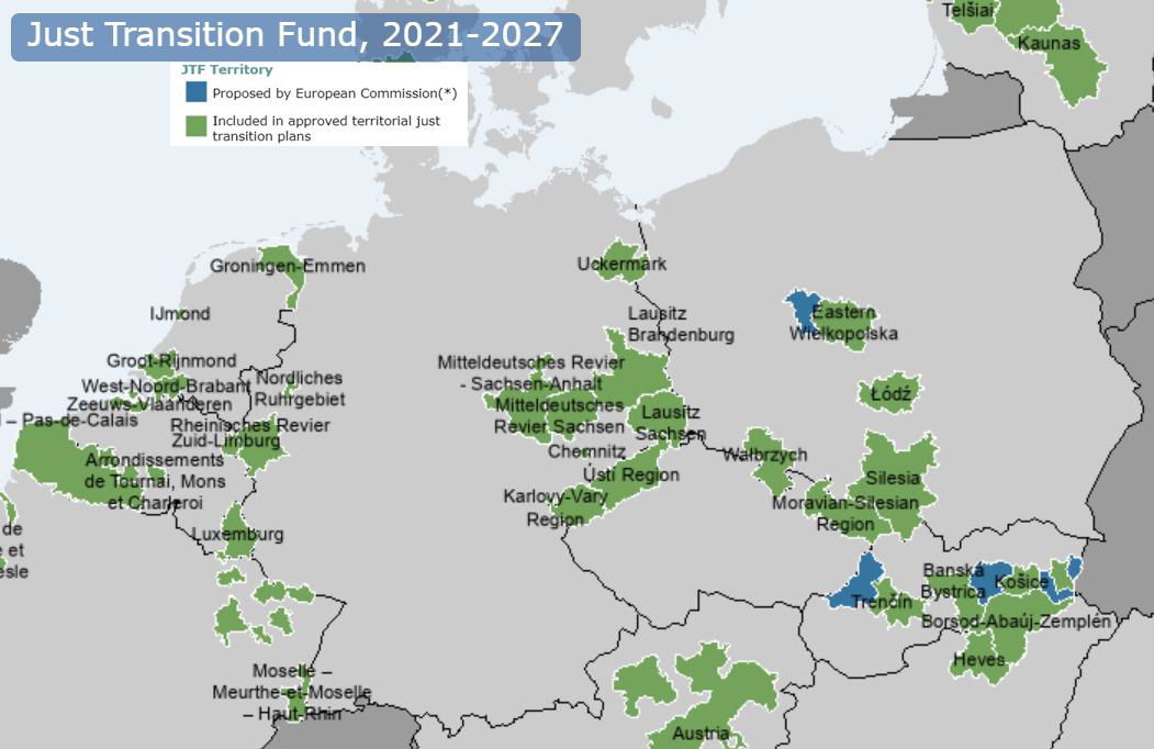 The mining regions in the European Union are undergoing an energy transition moving from a fossil fuel based economy to a sustainable, low-carbon, circular economy. The set of carbon climate neutrality targets adopted by the European Union pose a huge challenge to the European mining regions to carry out a just transition (Kiewra et al. 2019, McCauley& Heffron 2018), which will require changes at the social, economic and technological levels. Each partner country of the RAISING project is at a different stage of this process. Figure below depicts the Just Transition Fund territories (2021-2027) in Germany, Czech Republic and Poland.
